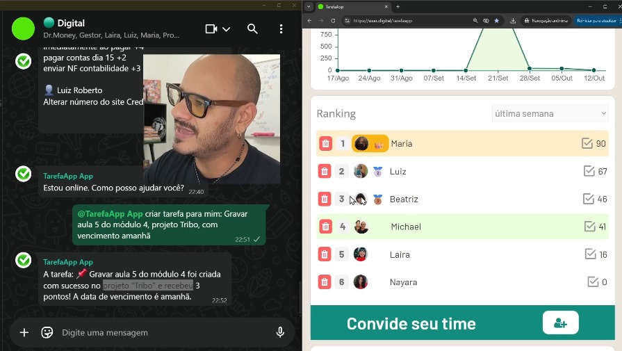 - Relatórios automáticos no WhatsApp: Para manter o controle sem exigir que o gestor acesse a web constantemente, o TarefaApp envia relatórios automáticos duas vezes ao dia, diretamente no grupo. Às 7h da manhã, ele envia as tarefas que estão em aberto para cada pessoa do time, e às 19h, ele envia o que cada integrante concluiu no dia.