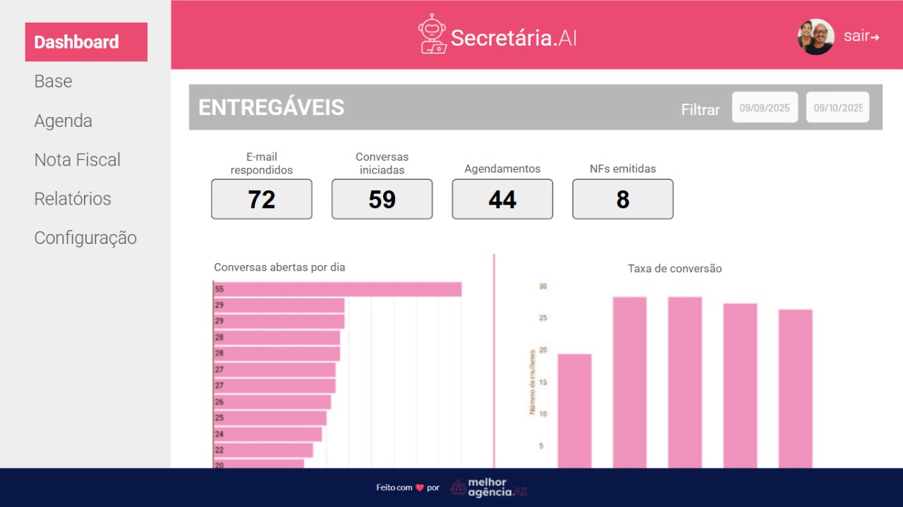 A Secretária AI registrou a emissão de 8 notas fiscais em 30 dias (em um exemplo dado), 44 agendamentos e 72 e-mails respondidos, tudo de forma automática.
