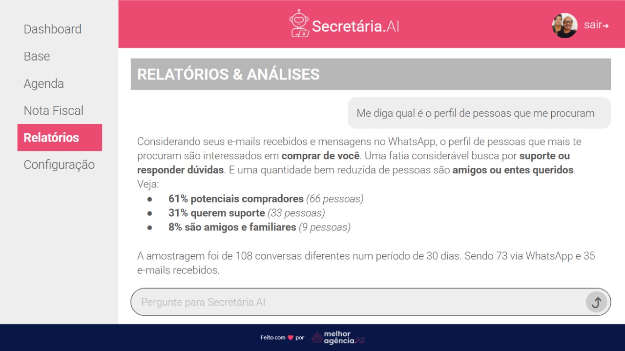 Esqueça relatórios estáticos. A Secretária AI é dinâmica. Você pode perguntar a ela, em linguagem natural, algo como: “Qual é o perfil de pessoas que me procuram?”.